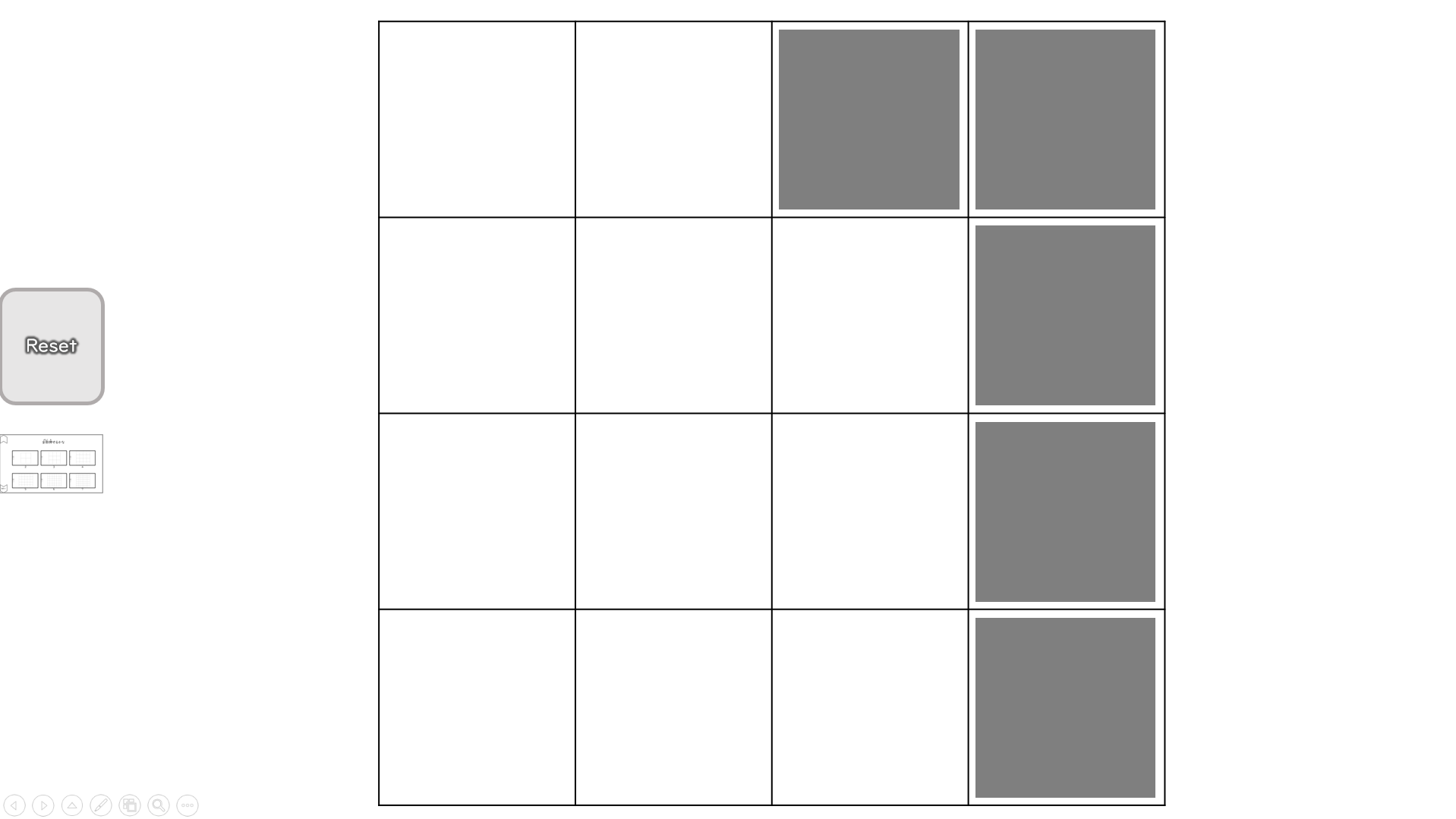 正方形が3×3=9マス並んでいて,1つ1つのセルを押すと,色が変わります。画面の左側の「Reset」を押すと,色を最初の状態に戻すことができます。
