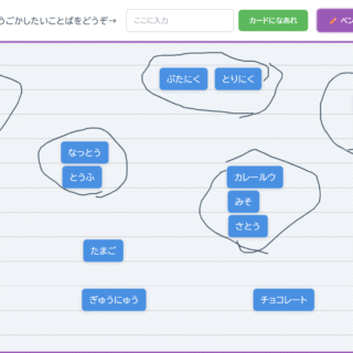 入力したことばをカードに変身させることができるWebアプリです。に文字を入力してボタンを押すと,罫線部分に入力したことばのカードが置かれます。ことばカードはドラッグ操作で動かすことができ,カードの右上の×印を押すと消すことができます。また,...