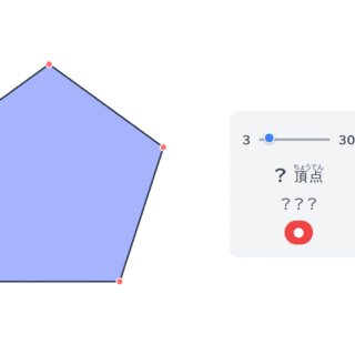 正○角形のWebアプリです。スライダーを動かすと,頂点が3個~30個の正○角形が表示されます。ボタンを押すと赤い頂点が表示されます。また,を押すと,やといった正しい数値が表示され,もう一度押すとで隠れます。 こちらのWebアプリはCanva...