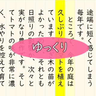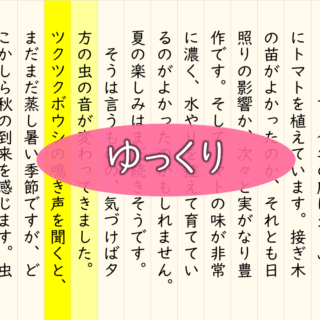 国語 02139[国語]ハイライトノート 28pt ゆっくり 小学部3段階想定。縦書きのノートの余白をさわると,その列が黄色にハイライトされます。少し時間をおいて元の色に戻るため,ハイライトをON/OFFする手間はいりません。02055ハイライトノート 28ptが7秒でしたが,この教材は10秒かかるゆ... 2025.10.09 国語