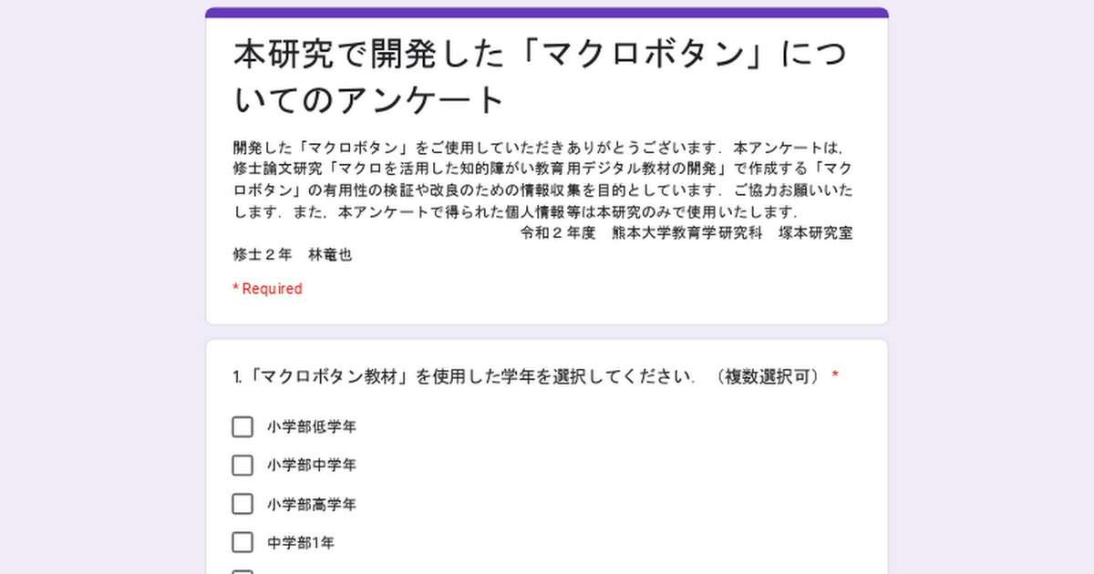 開発した「マクロボタン」をご使用していただきありがとうございます.本アンケートは,修士論文研究「マクロを活用した知的障がい教育用デジタル教材の開発」で作成する「マクロボタン」の有用性の検証や改良のための情報収集を目的としています.ご協力お願...